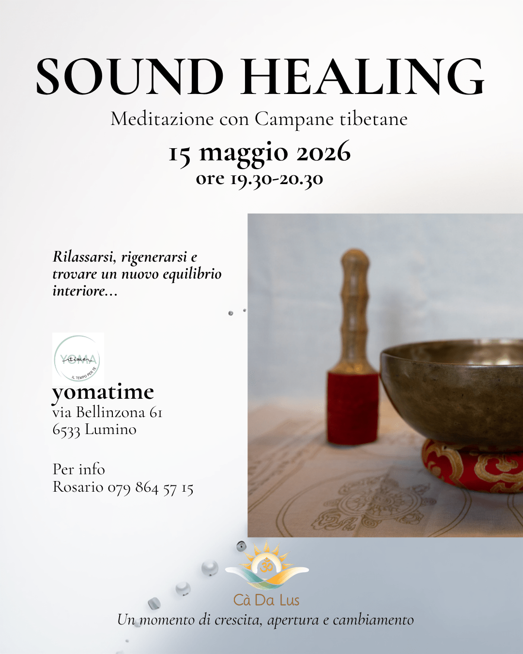 01 marzo 2026 17.30-19.30 6557 Cama Ritrova un momento per te stesso, la tua armonia, la tua serenità Riserva il tuo posto chiamando lo +41798348631