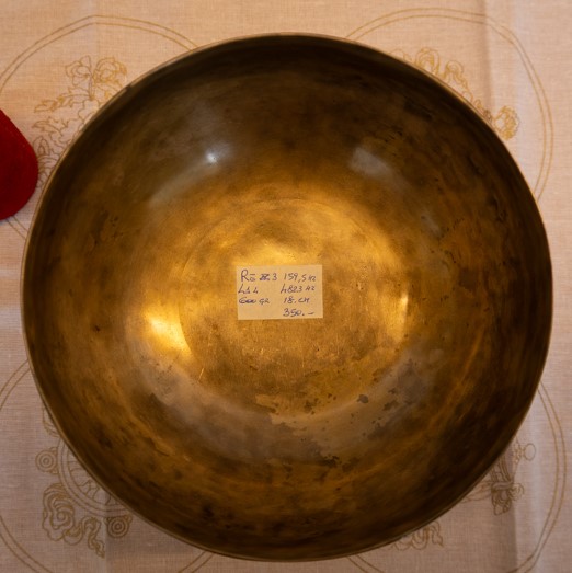 Con i suoi 18 cm di diametro e 600 grammi, si tiene perfettamente nel palmo: abbastanza grande da riempire lo spazio sonoro, abbastanza leggera da essere usata in sessioni prolungate di meditazione o massaggio sonoro diretto sul corpo.